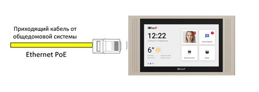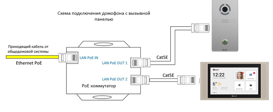 Видеодомофон можно подключить совместно с вызывной панелью. Для этого потребуется установка PoE коммутатора. Для питания самого коммутатора потребуется розетка 220в.